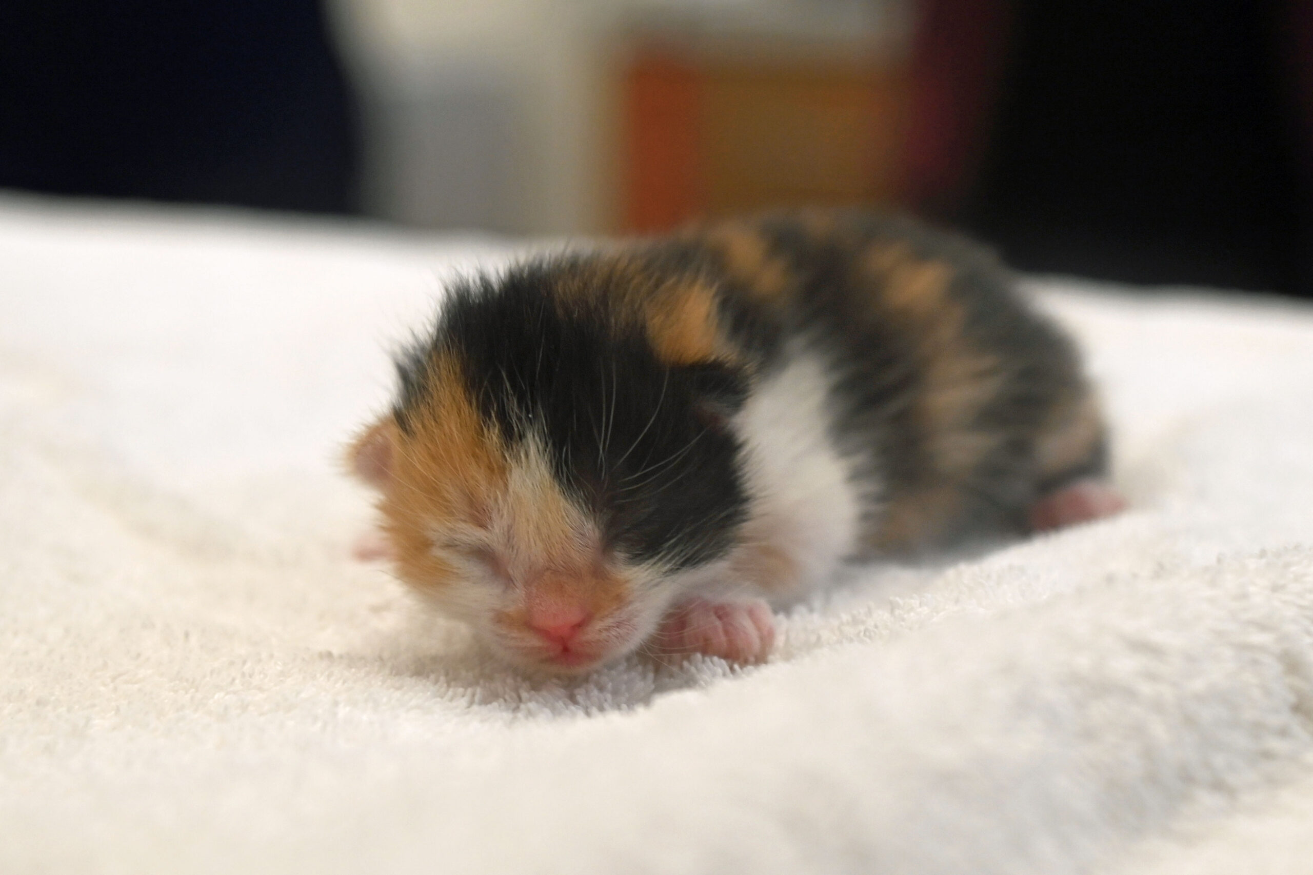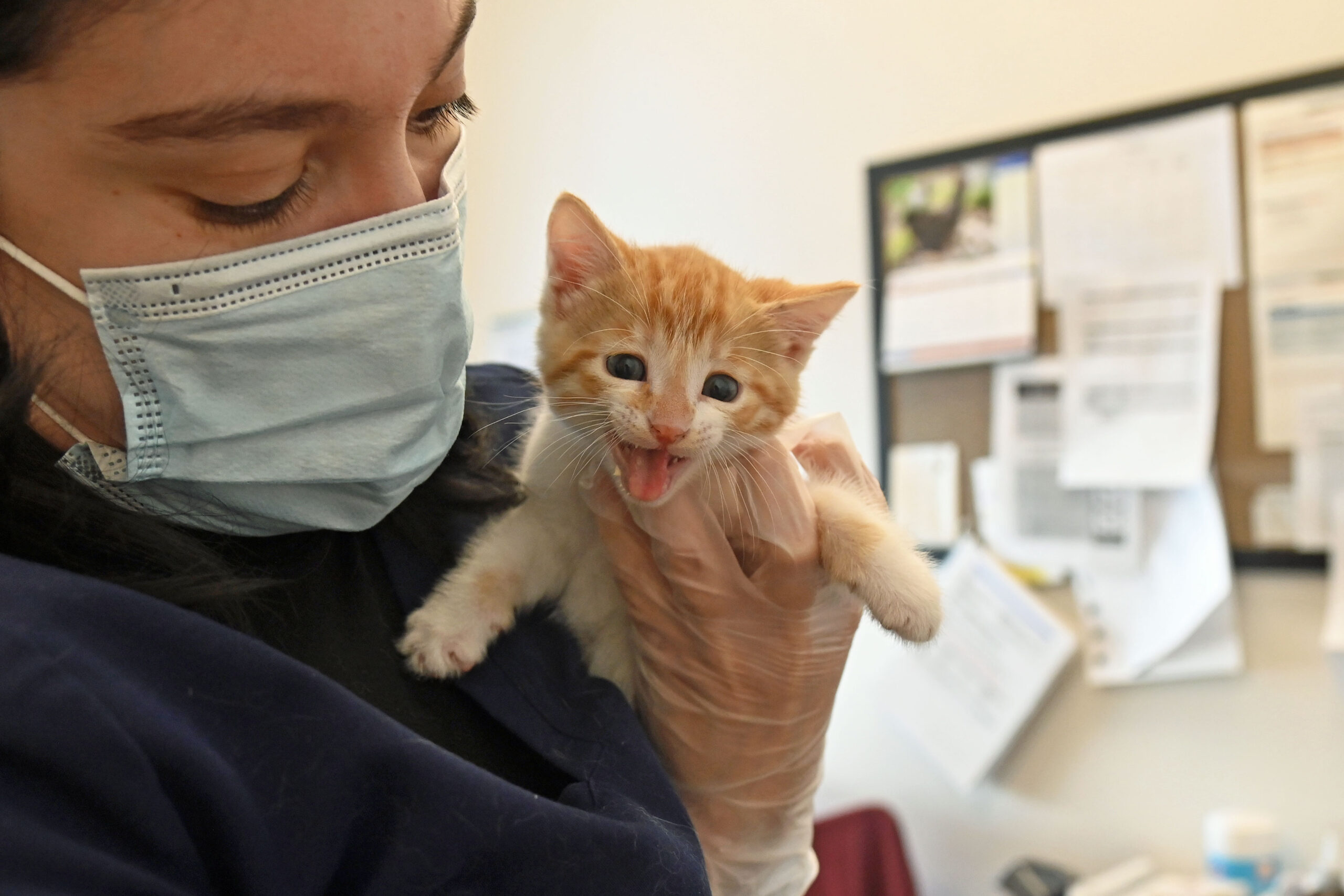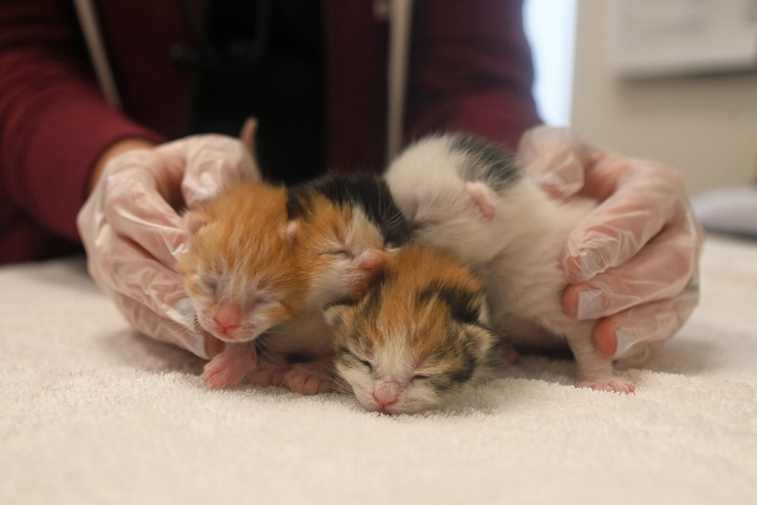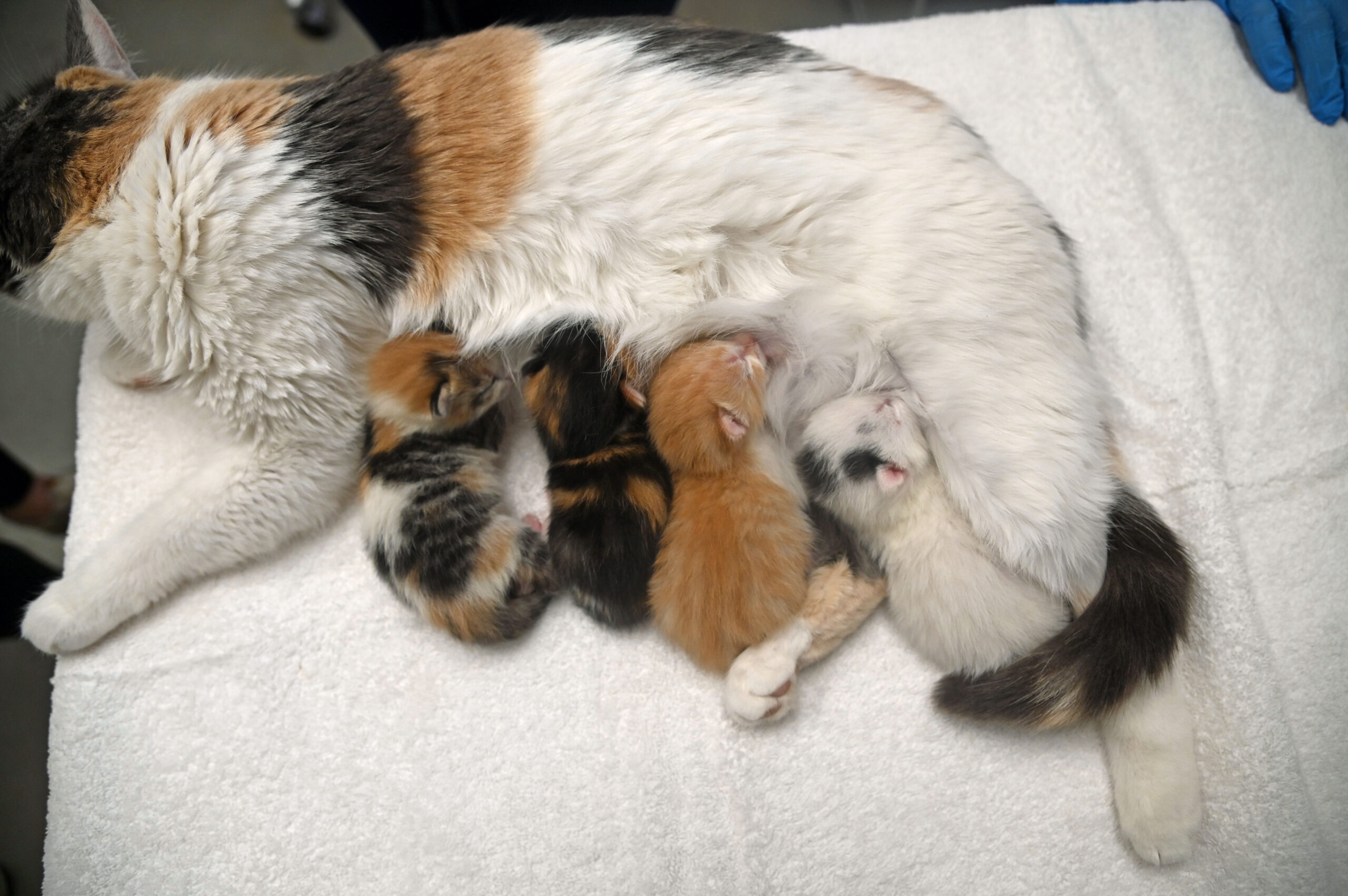 On March 28, 2024, Sunkist and the kittens arrived to receive their first vaccines and get another check-up to make sure they are all doing well! At 4 weeks old, they have fully opened their eyes and starting to discover their surroundings and personalities.