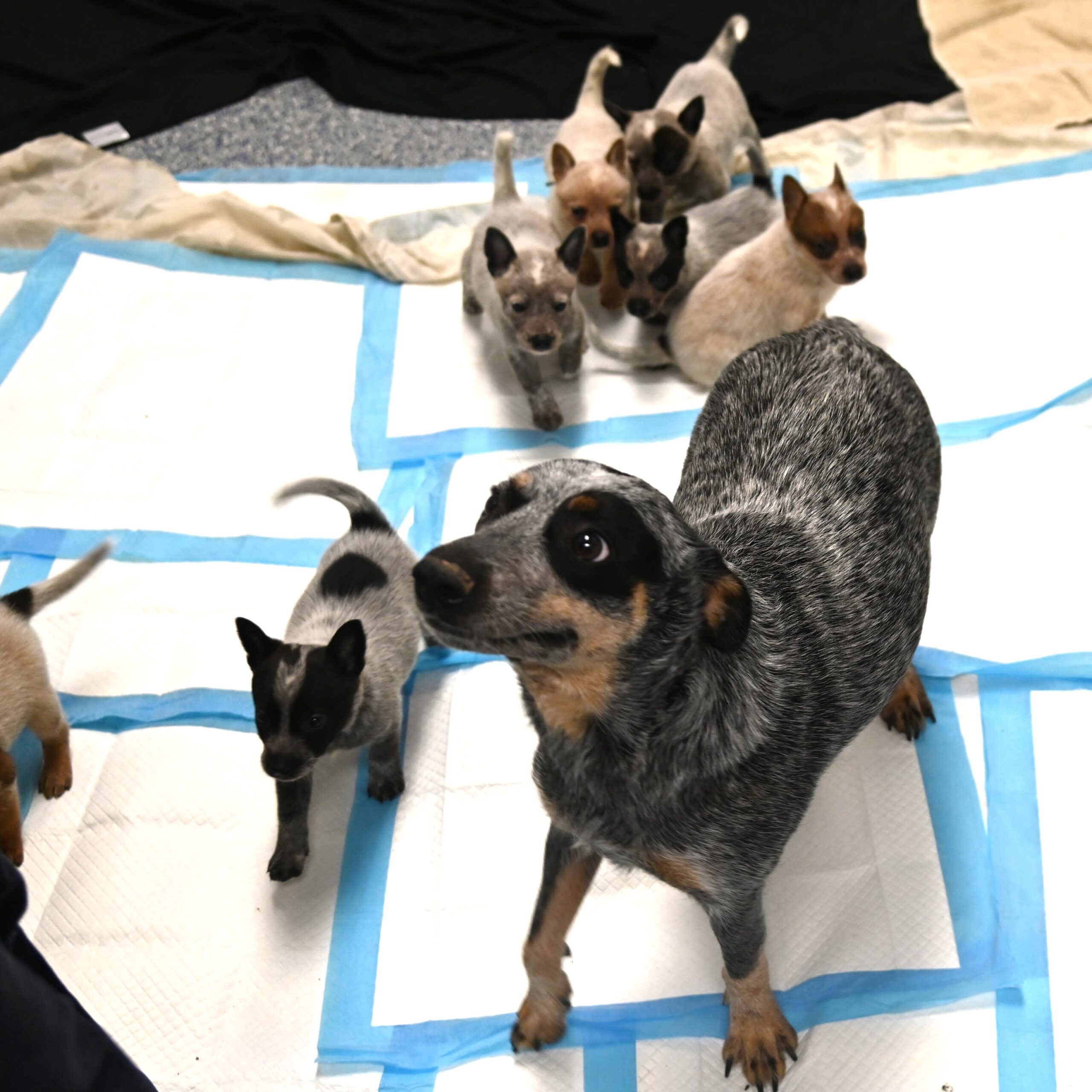 Arriving via Helen Woodward Animal Center’s Rescue RV, a beautiful Blue Heeler Cattledog, named Riley, made the trip with her ten puppies. The canines had been relinquished to SPCA LA in mid-January, when Riley gave birth to the surprisingly large family, and her owner didn’t feel equipped to care for them.