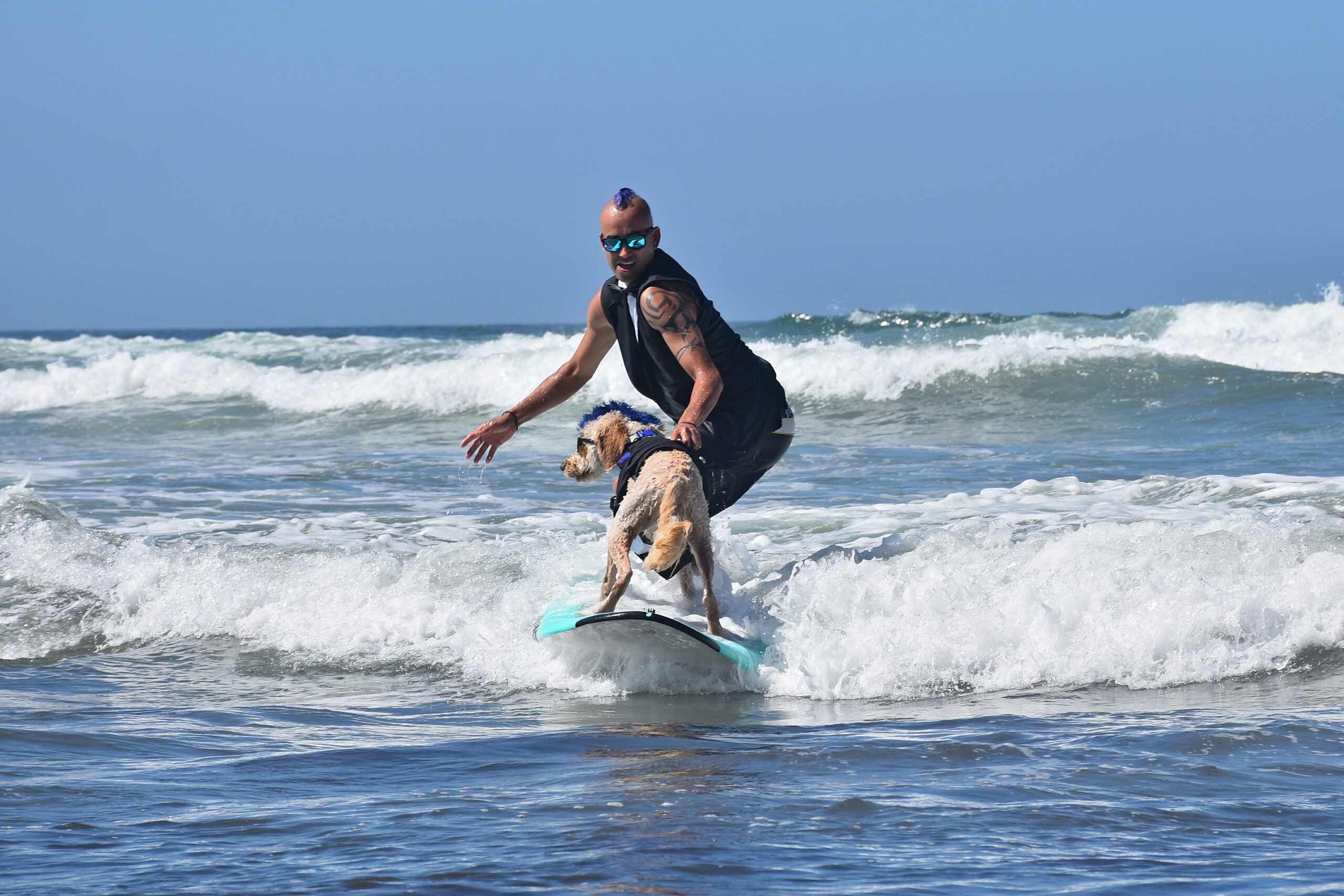 Following the ceremony, the canine surfing will begin.  Hoping to join a coveted list of “Top Surf Dogs,” more than 70 surfing dogs will compete in 10 minutes heats. SurFURs will show off their skills before a panel of judges consisting of celebrities, surf pros and aficionados. Canines will be judged on the length of their ride, wave technique, and enthusiasm and confidence on the board. First, second, and third place winners will be awarded for each weight class and the first-place winners will move on to the finals – Best-In-Surf.  But the fun on the water doesn’t end there. A unique freestyle surf contest will award points for creativity! Tandem rides for dogs who can ride with their best friends and even their favorite human, eye-catching tricks and costumes are encouraged to wow the judges.