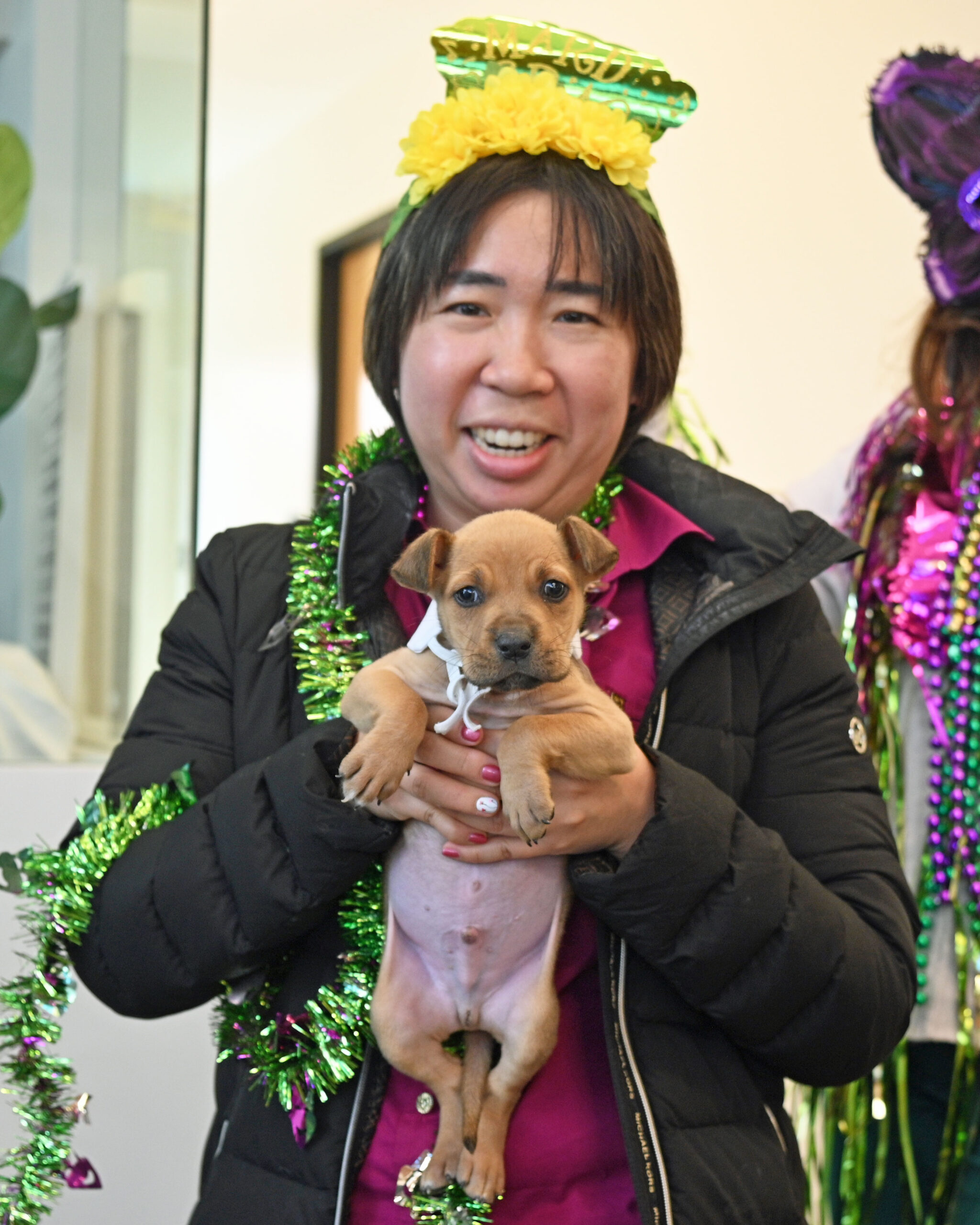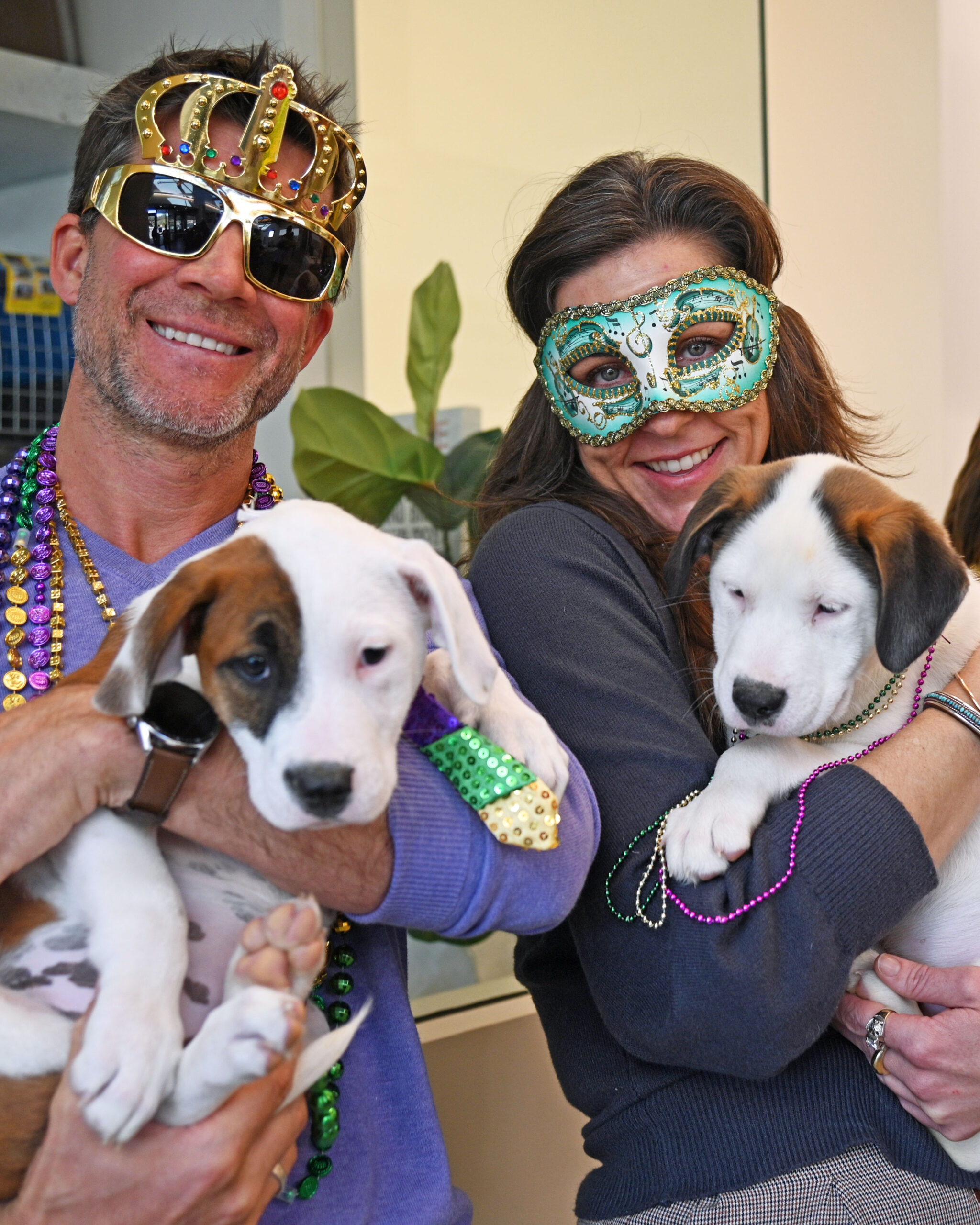 In answer to the pleas, Helen Woodward Animal Center is bringing in large numbers of animals weekly, in an effort to save lives. This week, puppies arrived from as far away as Texas, Louisiana and Oklahoma and while over 60 will be available for adoption, another 50 will wait with Center foster families for kennels to open up, and another 80 are on a waiting list to be transferred to the Center next week. The saving of these lives is a true reason to rejoice and doing it Doggie Gras-style amps up the celebration in a wonderful way.