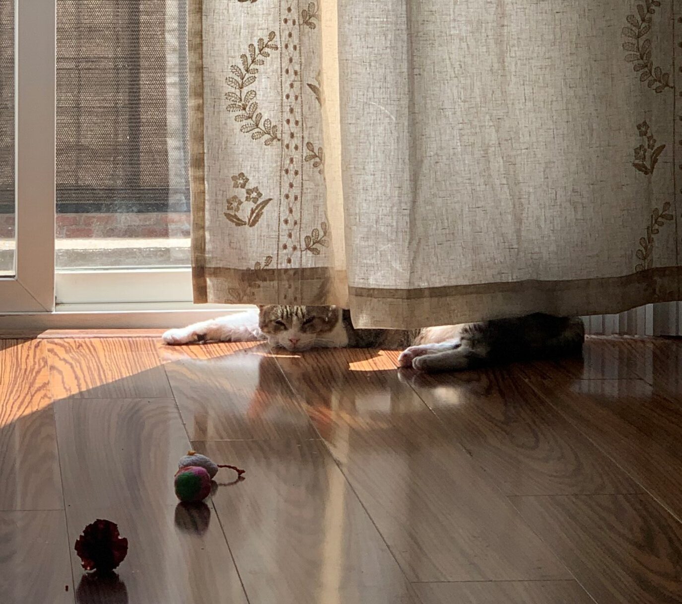 Armand was one such pet who didn’t show incredibly well in the shelter system. The five-year-old heather gray and white cat first came to the Center at the end of March this year. As he was older and wiser than our normal feline fare, our animal care team set him up in the deluxe Solarium suite. There, he had everything he needed — a nice big litter box and water bowl, plenty of toys, and premiere cat food. And yet, he spent his days hiding in his cat tree. No matter what, he wouldn’t leave. Volunteers could pet him and he would purr, but he still wouldn’t leave his cozy cat tree.