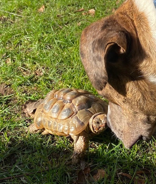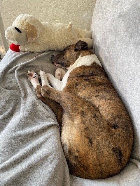 Rascal now goes by Enzo and he’s become quite the cuddle bug. When he’s not curled up with his favorite toy, he’s playing with his new best friend Lucky the tortoise, or Hudson the golden retriever.