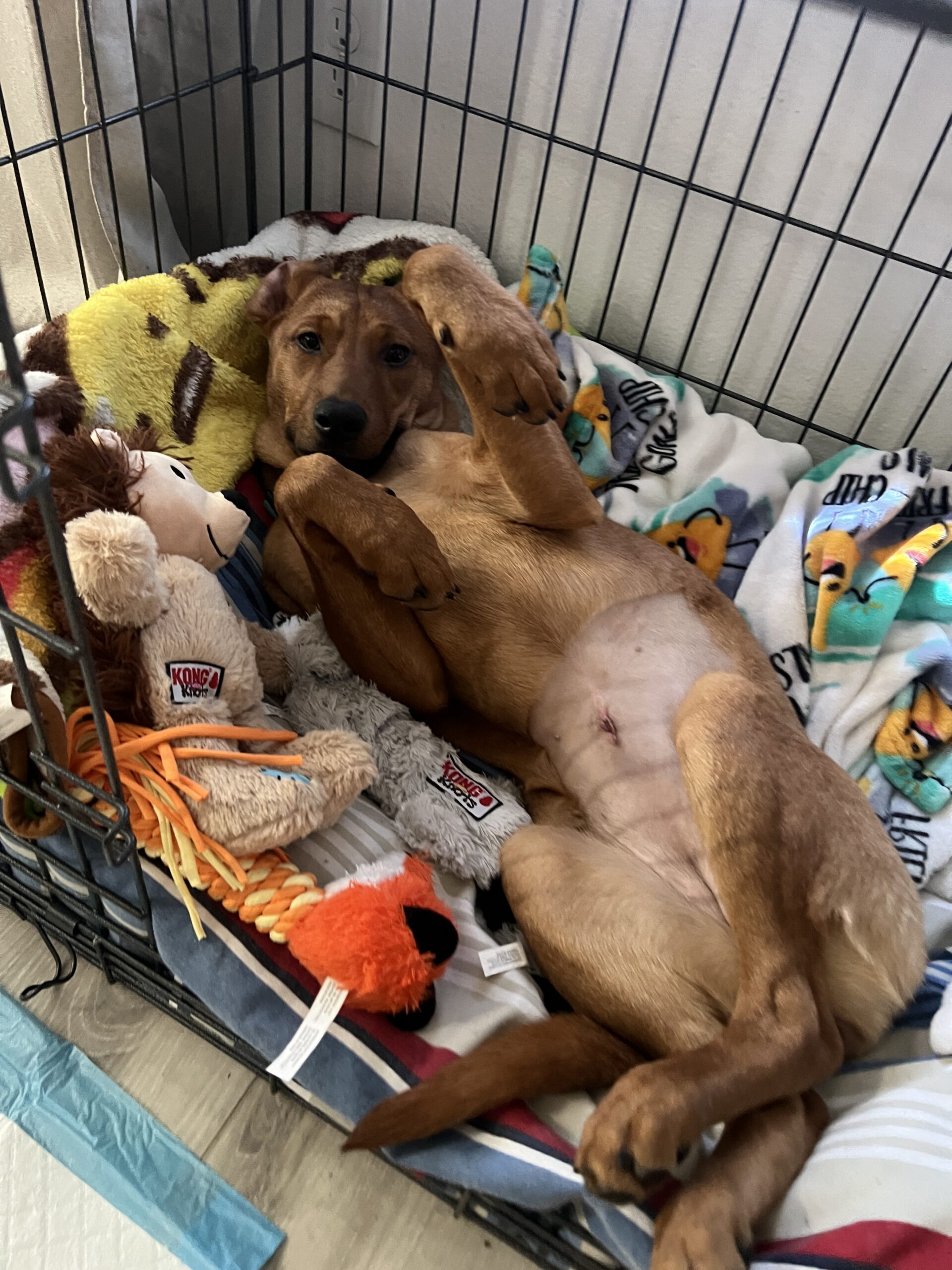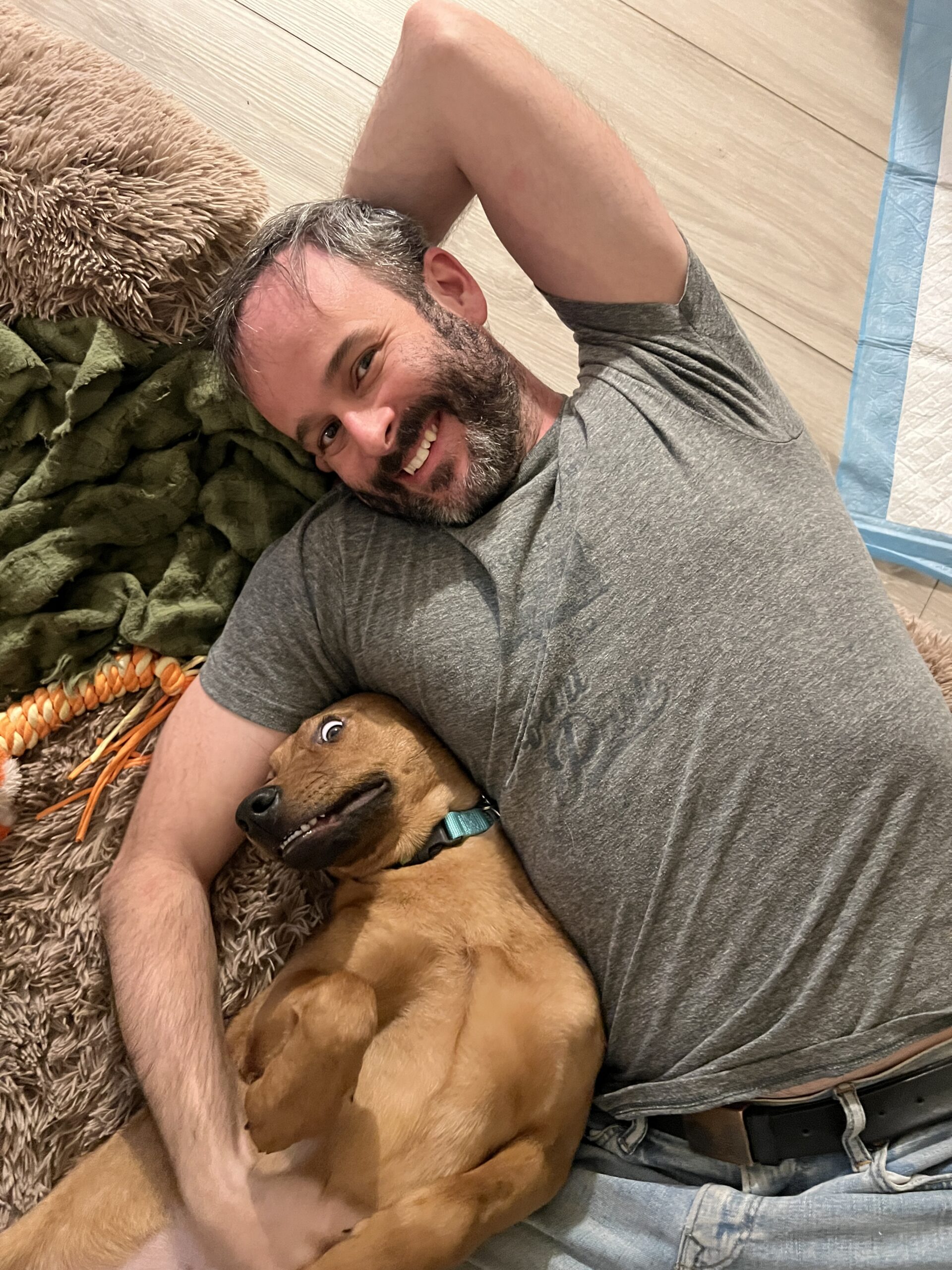 “She is a real light in our life right now and is blossoming more and more every day. She is crate trained, pee pad trained, toy/food motivated, very gentle, and a total daddy’s girl.”